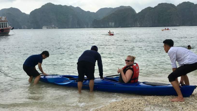 Daarna was het tijd voor vertrek en kregen we een uitgebreide buffet lunch. Ondertussen doemden om ons heen de indrukwekkende kalkstenen karstformaties op. Een gevoel van rust kwam over me heen. Ik dacht ook echt; wat een bofkont ben ik toch, varend op een luxe boot met uitzicht op het meest Zen achtige landschap. Het landschap is vrijwel onaangetast doordat er hier maar weinig vrachtverkeer is en er nauwelijks cruiseschepen doorheen varen. Na de lunch mogen we het kristalheldere, blauwe water in. Om te zwemmen en te kajakken bij een piepklein strandje. Een waar paradijs!